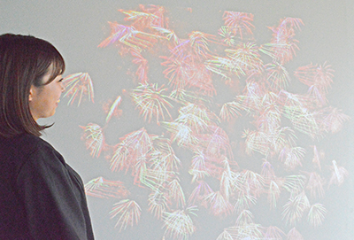 職員OBが撮影した23枚の写真を使って2分間のスライドショーを作成し、壁に投影。色鮮やかなスターマインや迫力の大玉など、当日の打ち上げ会場での興奮がよみがえるような写真が次々と登場し、来庁者らの目を楽しませている。