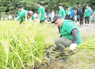 収穫祭には主催4団体とエバグリーン廣甚ほか支援・協力する行政、JA、市場、農業の関係者や地域住民ら合わせて約300人が集まり、あいにくの雨の中、小浦区の山本源昭区長、来賓の松本秀司町長があいさつしてスタート。株式会社クボタによる大型農機展示の後、町内産新米のおにぎりが振る舞われた。手刈り体験では参加者が雨上がりの田んぼに入り、鎌を使って収穫。子どもから大人までが楽しみ、米が当たる抽選会も大盛り上がりだった。
