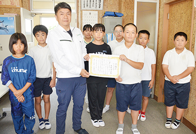 感謝状の贈呈式は校長室で行われ、前田代表、同校児童会の役員と運営会の8人が参加。児童会長の古井慶杜君(6年)が「これからは安心・安全に遊ぶことができます。学校を代表して、心からお礼を申し上げます」と感謝状を読み上げて手渡した。