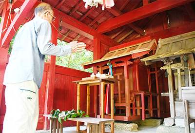 日高町誌によると1909年(明治42)に津久野・比井唐子谷の稲荷神社を合祀。現在の形になり、シロアリによる食害で傷んでいた。補修修理は皿山守総代長(78)ら氏子たっての願いで、県の保存活用(補助)事業を活用。地元の山中建築が請け負い、今年5月から大工の山中雅嗣さん(48)=比井=と大工の大田仁司さん(48)=志賀=が共同で行った。