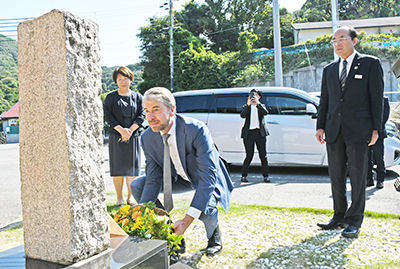 デンマークのヤール・フリース=マスン駐日大使が26日来県。午前中、日高と美浜の両町を訪れ、68年前に日本船員の救助に力を尽くして殉職した同国のヨハネス・クヌッセン機関長の供養塔、顕彰碑に献花した。
