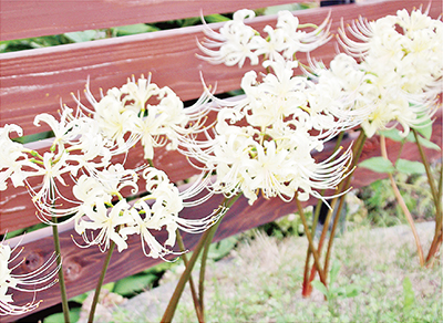 長岡さんは「植えたわけでもないのに、今年初めて咲いた。最初は赤いヒガンバナが枯れて白くなったのかと思った」と話している。