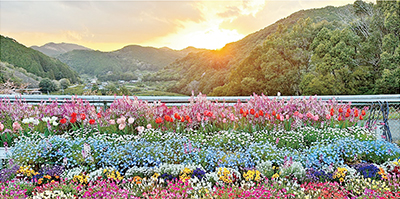 同校では放送栽培委員7人が中心となって毎年、花いっぱい運動を展開している。今回は校庭の遊具ゾーンの花壇にリナリア、チューリップ、アリッサム、パンジー、リビングストンデイジーなどたくさんの種類の種を昨年の秋にまいた。全校児童がかかわって水やりや草引きなどの世話をして、4月に赤、ピンク、白、黄色、青など色とりどりの花を咲かせ、夕日をバックに撮影した写真で応募した。