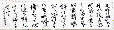 今回の受賞作品は調和体(漢字仮名交じり)で、「住井すゑの文」。住井すゑは「橋のない川」の著者として知られる作家。随筆「朝草」の一節、江戸時代の俳人で松尾芭蕉の弟子・野沢凡兆についてつづった文を2尺×8尺の用紙に12行で書いた。俳人であり医師でもあった凡兆に思いを馳せて書き、中央の平仮名の並ぶ部分は変化をつけるのに苦心したという。「以前、全国紙に連載していた住井すゑの文を読んでおり、骨格のしっかりした文章構成と反骨精神に共鳴していました。近藤先生の創立した新書派協会が70周年を迎える記念すべき年に入選でき、うれしく思います。多くの皆様の応援により結果が出たことは大変ありがたく、感謝しております。まだまだ未熟な作ですが、少しでも次元の高い作品を目指して頑張りたいと思います」と話している。