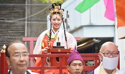 時代行列では宮子姫役を市観光PR大使の坂尻夏海さんが務め、同じく観光PR大使のにしゆきさんも時代衣装を着て参列。藤原不比等役の山本尚北吉田区長、紀道成役の小池昇平吉田区長、男官、女官役の大成中生徒とともに吉田八幡神社まで練り歩いた。坂尻さんは山車の上で一寸八分の観音さまを大切に持ち、見物人に笑顔で手を振った。道中では餅まきもあり、吉田祭の子ども神輿と合流し、同神社でお払いの神事を行った。