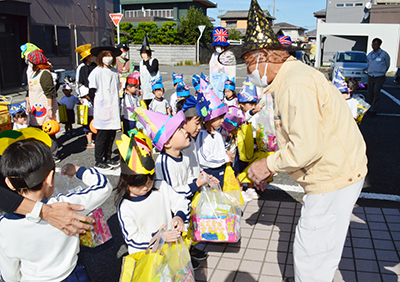 園児は自分たちで作った魔女やモンスターの帽子をかぶって薗会館を訪れ、「ハッピーハロウィーン」「トリック・オア・トリート(お菓子をくれなきゃいたずらしちゃうぞ)」と元気いっぱい。自治連役員も魔女やドラえもんの仮装をして出迎え、お菓子をプレゼントした。お礼に園児はピーター・ホールさんのギター演奏に合わせてダンスを披露した。