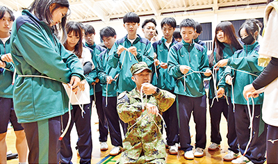 紀央館高校は1年生143人を対象に防災教育を行い、自衛隊員がロープワークと応急担架づくりを指導した。ロープワークでは命綱に用いられる「もやい結び」などを学び、生徒らは説明を受けながら繰り返し練習した。担架は棒と毛布を使う方法を習い、最後は競技形式で技能を確かめ合い、真剣に取り組む姿が見られた。2、3年生はシェイクアウト訓練と防災に関する映像学習を実施した。