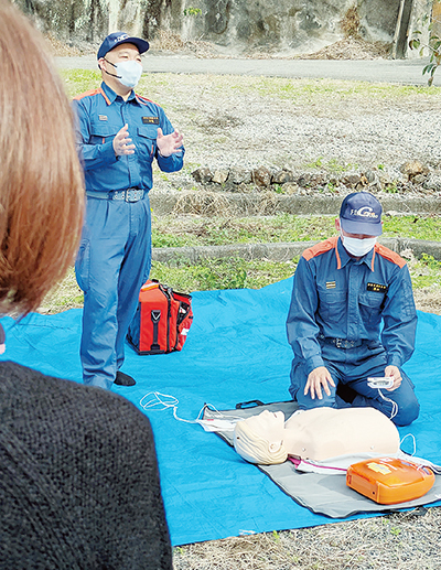 御坊市では全体で約1800人が参加。午前9時に地震が発生したとして大津波警報が発令されると、湯川町の西富安区(芝田隆行区長)では津波避難場所となっている高台の広場「明神(めんじ)さん」に約50人が集まり、市消防本部職員による人形とAEDを使った救急救命実技講習が行われた。