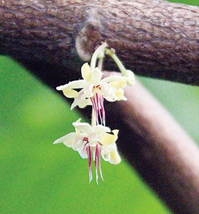 日高川町和佐、チョコレート製造工場の株式会社たにぐち敷地内「チョコっと農園」で栽培されているカカオ(チョコレートの原料)が、花を咲かせた。
