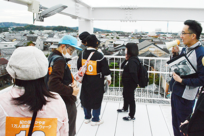 まちの歴史や防災に関係する豆知識を学ぶとともに、自分の足で歩くことで健康増進につなげ、災害から避難できる体力をつけてもらおうと、旧御坊町内の約3㌔、歩数にして6000~7000歩のコースを設定。参加者は市職員の案内を受けて小竹八幡神社、茶免地蔵、古い町並みなどを巡った。