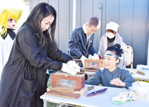新町地区津波避難タワーでは階段を上って最上階まで行き、海抜11・42㍍、収容人数690人、雨除けのテント設置などについて説明を受け、普段見る機会がないタワーから望む景色を楽しんでいた。