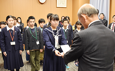 産品販売に参加した15人のうち13人が町青少年健全育成町民会議の周家洋平会長と一緒に役場を訪れ、代表して高石朋和さん(稲原中2年)が「被災地の支援に使ってください」と日裏町長に手渡した。日裏町長は「皆さんが一生懸命販売し、気持ちのこもった義援金は赤十字を通じて届けます。これからも困っている人を助ける思いを育んでください」と激励した。