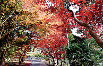 本堂に近い参道の両側にモミジが十数本植えられており、毎年きれいに紅葉している。今は色づいた葉が参道に覆いかぶさり、まるでモミジのトンネルのよう。西側のモミジは燃えるような赤、東側のモミジは緑から赤へと色づき始めたところで、これからピークになりそう。檀家の男性は「ぐっと冷え込んできたので、紅葉も進むでしょう。モミジのトンネルを見に来てください」とPRしている。