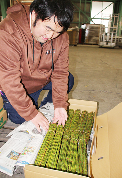 農家で収穫されたズバイは50本単位に束ね、500本入りの箱詰めにしてみなべ町気佐藤の統合選果場に運び込まれる。昨年は枝に黒っぽい斑点が現れる「すすはん病」が目立ったが、今年は病気の被害が少なくきれいな枝が多いという。出荷量も出足から好調で、JAでは例年並みの40万本の出荷を見込んでいる。今月中旬まで続く。