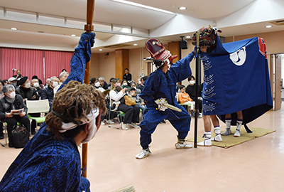 重箱獅子は県指定文化財。笛や太鼓の音色に合わせる舞獅子とは違い、無音で舞うのが特徴。協会幹事で県教育庁文化遺産課の蘇理剛志さんが「無音で緊張感がある。足踏みやササラの音を感じながら見てほしい」と紹介。東山口青年団員がオンとメンの2体の鬼と、獅子を舞い、集まった約80人の来場者から大きな拍手が送られた。
