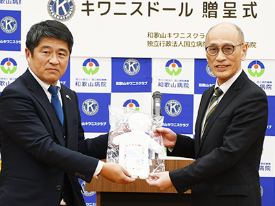 笑顔や心を支える存在に――。美浜町の独立行政法人国立病院機構和歌山病院(南方良章院長)に19日、子ども支援を行う奉仕団体の和歌山キワニスクラブ(小池康之会長)から、手製の人形「キワニスドール」20体が贈られた。