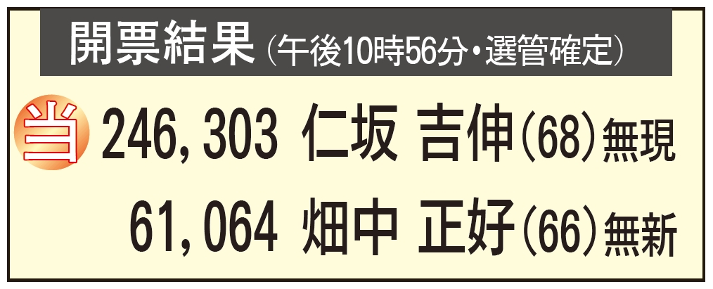 任期満了に伴う知事選は25日に投票、即日開票され、無所属の現職仁坂吉伸氏(68)=和歌山市東高松=が24万6303票を獲得、同じく無所属の新人畑中正好氏(66)=田辺市天神崎=を18万5000票以上の大差で破り、4選を決めた。4年前と同じ2人の対決となった今回、仁坂氏は前回同様、強固な組織力で日本共産党推薦の畑中氏を圧倒。仁坂氏は支持者に感謝のうえ、「人の意見に耳を傾け、より元気な和歌山にしていきたい」と笑顔で決意を示した。