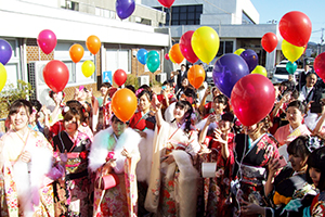 美浜町は地域福祉センターであり、対象者75人(男31、女44)のうち62人(男24、女38)が出席した。森下誠史町長は昨年、行方不明の男児を発見したことで「スーパーボランティア」として一躍有名になった尾畠春夫さんを紹介したうえで「きょうのこのよき日を契機として、ふるさと美浜町の発展のために皆さんの知恵、力、心を振り向けていただきたい。美浜町に住みながら、また遠くの地から、ふるさとを思い、それぞれの立場から支え、盛り上げてくださることを期待している」と式辞。新成人を代表して、いまアメリカで音楽を勉強中という吉川真さん(和田)が「これからも向上心を持って過ごしたいなと思う」と誓いの言葉を発表し、乾杯やバルーンリリース、記念撮影も行われた。