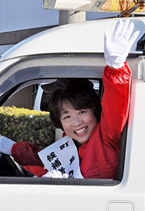 写真=手を上げてアピールする籔内候補