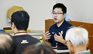現場は、潮吹き岩の西約200㍍、波打ち際からすぐの磯で、25日午後、三尾のゲストハウス&バー「ダイヤモンドヘッド」オーナー大江亮輔さん(37)が客から話を聞いて見に行くと、3㍍を超えるクジラが横たわっていた。8月から三尾に住んでいる現役東大生岩永淳志さん(21)や地元の人も訪れ、「こんなの見たのは初めて。この前の台風で打ち上げられたのかな」と首をかしげていた=写真=。