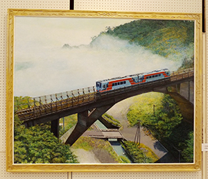 作品は「三陸 リアス線」。岩手県へ旅行した時に撮影した三陸鉄道の写真をもとに描いた。「さんてつ」の愛称で住民に親しまれる鉄道で、東日本大震災で被災、一時は休業していた復興のシンボル的存在。F100号(130×163㌢)の大作で、8ヵ月ほど掛けて点描で制作した。白い霧に覆われた山間の鉄橋を渡る列車をダイナミックに捉え、山の緑などが美しく描かれている。「絵はずっと好きで、楽しみながら描いています。そこに賞をいただくという目標を掲げることで、より充実した時間を過ごしてきました。描き方も自分で工夫して編み出したもので、努力を積み重ねてきたことが評価していただけてうれしく思います。人生は自分でつくるもの、他人になんとかしてもらうものではないと、この年になって実感しています」と喜びをかみしめ、「次は抽象画や人物画でも入選できるように、挑戦を続けていきたいですね」と意欲的に話している。