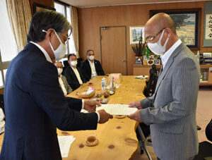 この日、認知症当事者の山際裕三さん(80)=薗=、林香代子さん(81)=湯川町財部=、山際さんの長女北山善子さん(52)=同町小松原=と、市内の日高博愛園、日高博愛園しおや、あがら花まる、支援センター藤田の職員・スタッフが市役所の市長応接室を訪問。スターチスで「ありがとうございました」の文字を手作りしたフラワーアート作品と、これまでの取り組みや当事者らの笑顔の写真で作られたNPO法人地域生活サポートセンター(東京)からのパネルを手渡した。