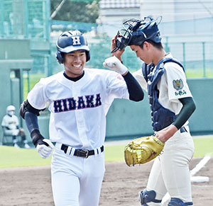 日高は初回、2死一、三塁から矢田の右前適時打で先制。3点を追う6回、無死から杉元の右中間への二塁打に続き、矢田が中前に適時打をはじき返して2点差に迫った。なおも四死球で2死満塁とし、新野が中前に同点の2点適時打。さらに8回2死から新野が逆風を切り裂き右翼スタンドへ、決勝となる大会第7号の本塁打を叩き込んだ。