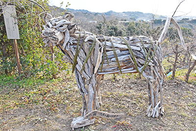 2018年に梅の剪定枝だけでシカとイノシシを作ったのがきっかけで、翌年から流木も使って干支を制作。南部梅林に訪れる観梅客を楽しませてきた。昨年は休園だったことからオブジェも作らず、2年ぶりに登場した。