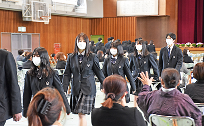 紀央館では普通科114人、工業技術科32人、計146人が巣立った。卒業生は胸に赤い花を飾り、拍手の中を入場。久原享校長は各クラス代表に卒業証書を手渡し、「社会への一歩を踏み出す皆さんには、学び、考えること。思いやりの心を大切にし、豊かな人間性を備えること。この二つをお願いしたい」と式辞した。中野樹(いつき)さんが卒業記念品目録を贈呈。普通科2年の角美咲さんが送辞、卒業生を代表して工業技術科の吉田礼斗(あやと)君が答辞を述べた。コロナ禍での文化祭や部活など振り返り、「この3年間は一生の財産」として恩師や家族、仲間に感謝した。