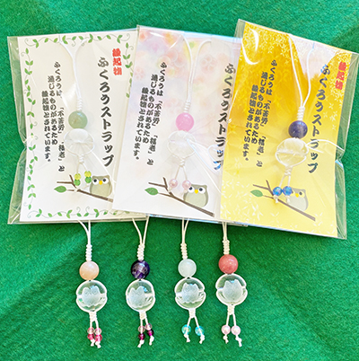 写真は、ふくろうストラップ。ふくろうは、「福老」「不苦労」の当て字があるように、縁起が良いものとして親しまれています。枝に止まったふくろうが彫刻された12㍉の水晶ビーズでストラップを制作。かわいらしさとユーモラスさで癒やされます。