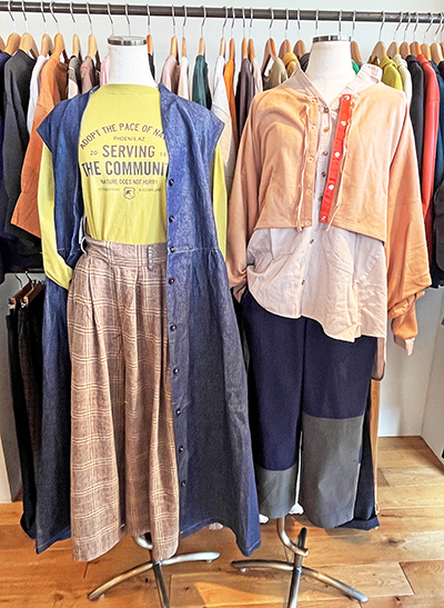 店内にはオシャレなアイテムを多数ラインナップ♪ カラフルな色合いのトレーナーベストをはじめ、長袖Tシャツ、秋らしいカラーのブラウス、人気のチェック柄やシンプルな柄物、定番の無地などいろいろ取りそろえ。どのアイテムもカラフルなカラーから秋らしいカラーまで種類豊富。
