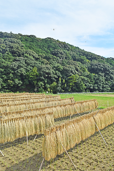 9月も中旬、稲刈りシーズン真っただ中。印南町印南原の田んぼでは、昔ながらの稲の天日干しの光景が見られ、秋への移り変わりを感じさせている。