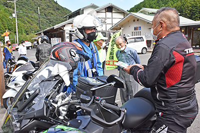 秋の行楽シーズンに増加するバイクの事故を抑止しようと、田辺署等は25日、ツーリング客が多い田辺市龍神村で街頭啓発を行った。
