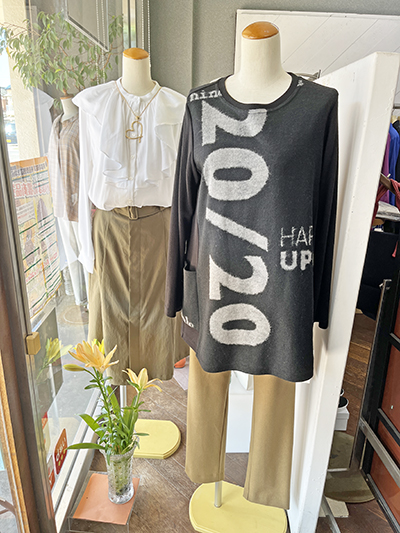 「『まだ暑いけれど、着こなしは秋っぽく』をテーマにコーデを楽しんでください。カットソー(1万円以上の品)をメーカー協賛価格の3900円で販売しております。商品をお買い上げの方に津村さんの玉子1パックもプレゼント中です」。