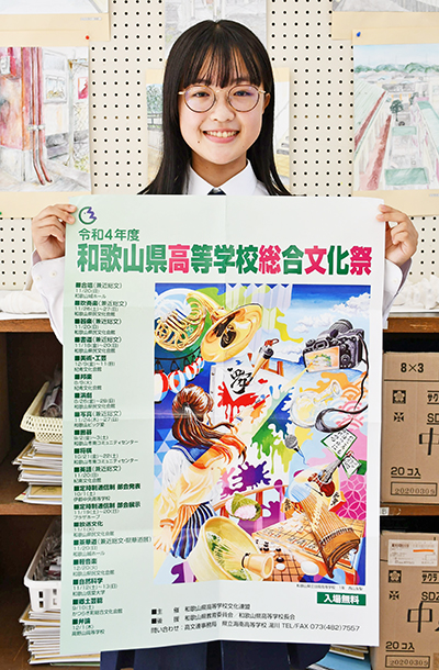 11月を中心に県内各地で展示や発表が行われる県高校総合文化祭のポスターに掲載される絵画に、日高高校美術部の西山友梨さん(1年)の作品が選ばれた。文化祭で行われるさまざまな部門の道具を、きれいな色使いで描いた作品。ポスターは県内のすべての高校など総合文化祭関係の施設に掲示されている。