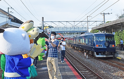 日高広域観光振興協議会では、日高地方1市6町のゆるキャラを集め、乗客のお出迎えとお見送りを実施。乗客は個性豊かなゆるキャラたちとの記念撮影や駅周辺の散策を楽しんだ。東大阪市の会社員山原道彦さん(56)は「銀河に乗るのは3回目です。和歌山の観光をしながらゆっくり乗車できるのが楽しいですね」と列車の旅を満喫していた。