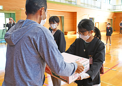 衣奈小には濵野一宏会長が訪ね、体育館で集まった児童たちを前に、ゆら早生の歴史や特徴、今年の出来を説明。「今年は梅雨や夏に雨が少なく、糖度が高いものが多いです。抜群においしくて甘みと酸味が凝縮された最高品質のものを持ってきました」と、児童会副会長の御影咲結さん(6年)と書記の高瀨陽菜さん(5年)に箱入りのまま手渡し、会長の米澤悠星君(6年)が「新鮮でおいしいゆら早生を持って来てくれてありがとうございます。和歌山県ではたくさんのみかんが作られていますが、由良町にもゆら早生というおいしいみかんがあってとてもうれしいです。おいしくいただきます」と礼を述べた。