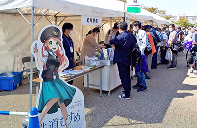 紀州鉄道のブースでは、受験生に人気の学門駅の切符が入ったお守りキーホルダーや数量限定の記念乗車券、鉄道むすめ「日高かすみ」のグッズを販売。売れ行きも好調で、鉄道ファンや親子連れ200人以上がブースを訪れた。