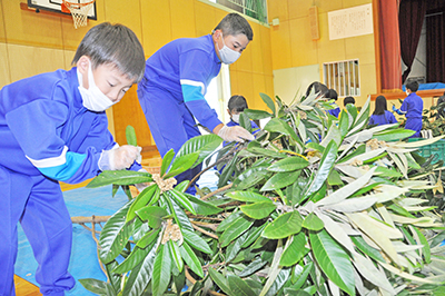 4年制の西口統伍君(10)は「ビワの葉は下の方に向かって引っ張ると簡単に外れます。少しでも困っている人の役に立てればうれしいです」と話していた。