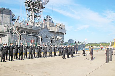 自衛隊和歌山地方協力本部の栫憲記(かこい・けんき)本部長が「30日には護衛艦あぶくま、自衛隊の装備品が公開されます。地域の人にも自衛隊のことを知ってもらいたい」、自衛隊和歌山協力会の村上義徳会長は「北朝鮮のミサイル発射など日本を取り巻く国際情勢は厳しさを増しているが、自衛隊の皆さんには領海、領空、領土を防衛するため、全力を尽くしてもらいたい」とあいさつ。地元の三浦源吾市長も歓迎の言葉を述べた。最後に黒河内信崇艦長が「30日までの3日間、日高港に滞在しますので、海上防衛の最前線で活躍している護衛艦あぶくまを見学してください」と語った。