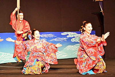 「沖縄燦燦」は、セリフがないノンバーバルのミュージカルで、言葉の壁がなくイギリス、フランス、ロシア、中国など各国で上演されている舞台。劇中は三線とバイオリン、太鼓等の打楽器に合わせて沖縄の島々に伝わるうたを演奏。男女2人の主人公が愛を育み、夫婦、親になっていく古き良き沖縄の暮らしを琉球舞踊をモチーフにしたダンスで表現した。海に漁に出る力強い男性、魚を売る女性たちの朗らかさを生き生きとした表情や動きで表し、夫婦の家を皆で建てるユイマール(ひとりでは難しいことを互いに助け合う)の精神や、豊年祭の様子など文化や風習も紹介。人と人がつながり、日々の出来事を共に喜び合い、生まれ育った場所を大切に思いながら生きる若者たちを演じ魅了した。