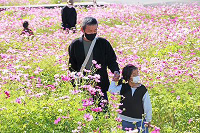 御坊市塩屋町南塩屋、森岡田人の会(前出勇会長)は6日、御坊総合運動公園進入路沿いのコスモス畑周辺でフェスティバルを開き、多くの家族連れらでにぎわった。