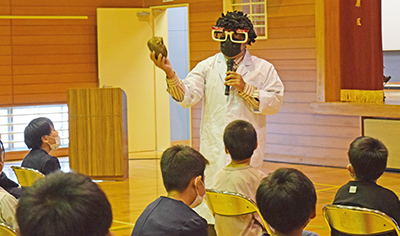 アフロヘアのかつら、大きなサングラスで登場した中尾氏は、「うんこの状態で健康が分かるんやで~」と軽快なしゃべりで児童らの心をつかむと「どんな食事をすれば健康になれますか」と問いかけた。バランスのとれたご飯を食べること、特に野菜をとることの大切さを解説。「お母さんが料理して野菜をおいしく食べられるように工夫してくれてます、カップラーメンもいいけど、ちょっと野菜を切って入れることも意識してな」と呼びかけた。