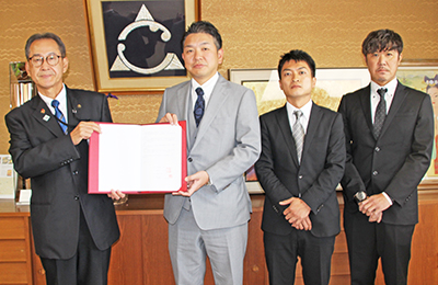 締結式は同日、市長応接室で行われ、同社から吉本社長、川東広宜管理主任、和歌山工場の北野高志工場長が出席。三浦源吾市長と吉本社長が協定書に押印した。