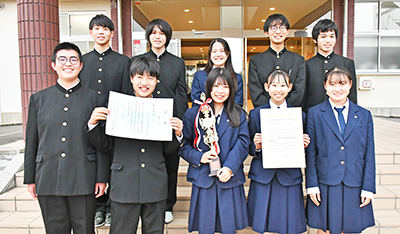 部長の杉山真由さん(2年)は「他の学校と違いを出そうと男女を逆転させました。3カ月練習してきた成果を、自信を持って披露することができました」と話し、「男女や学年の壁がなく、みんな仲がいいところがうまく劇に表現されたと思います。最優秀賞にはとても驚きました」と笑顔。主役のシンデレラを演じた坂元大和君(1年)は「エクステを付けたり女性の声のトーンや喋り方を練習したりし、本番で一番うまくできました。最優秀賞をとれて、とても達成感を感じています」と喜んでいる。