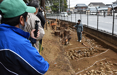 現地説明会には地元住民ら約30人が参加。県文化財センター埋蔵文化財課の川崎雅史さんは、「残存状況が良好で、構築当初の姿がうかがえる。山陰地方や近畿北部との交流があったと考えられる。当地域の墓制や地域間交流を考えるうえで貴重な発見」と説明した。御坊市から参加した男性は「弥生時代から遠くの地域の人と交流があったことが印象に残った。海を渡ってきたのでしょうが、弥生人は航海術に長け、フットワークが軽かったんでしょうね」と古代のロマンに思いをはせていた。