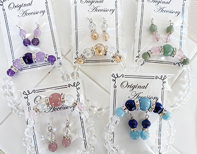 女子が憧れるティアラのような形のブレスレット。ゴールド、ピンク、ブルー、パープル、グリーン&ピンクの5種類のカラーがあります。同じストーンで作ったピアスとセットでいかがでしょう。