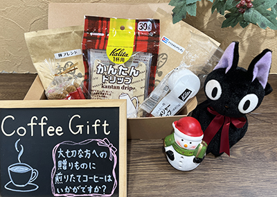 期間中、コーヒーのプチギフトセット2000円を1500円で販売! 内容はコーヒー豆100g2種類(クリスタルマウンテン、輝ブレンド)、かんたんドリップ(フィルター)、メジャーカップ、ロータスビスケット。クリスタルマウンテンは、華やかで香りがよく、上品な風味が特長。輝ブレンドは、コクがしっかりめのコーヒーで、ケーキとの相性も抜群♪ どちらもクリスマスの雰囲気にぴったりのブレンドです。