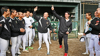 入山投手は、後輩が練習する同校グラウンドを訪れ、1・2年生の部員33人を前に「小さいころからの夢だったプロ野球選手に育成だけどなることができた。皆さんも目標や夢を持って頑張ってください」と激励。部員を代表して副キャプテンの出﨑大雅君(2年)が「分校生も中津から応援しています」とエールを返し、入山投手は「支配下登録を勝ち取るため初めからアピールできるよう頑張る。野球以外でも常に誰かが見ていると思って気を引き締めていきたい」と抱負も述べた。