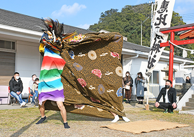 地元青年会(池ノ本勇二会長)の獅子舞奉納もあり、太鼓と笛の音が響くなか、蟹江司さん(22)、白樫彪矢さん(23)が威勢よく獅子を舞った。餅まきは新型コロナの影響で取りやめとなったが、会場は寒空を吹き飛ばすような熱気に包まれていた。